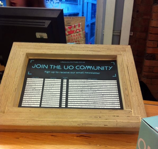 - Offline-Kontakte nutzen: Im Geschäft Liste auflegen, wo Kunden ihre E-Mail Adresse hinterlegen können. (Beispiel im Bild: Urban Outfitters)