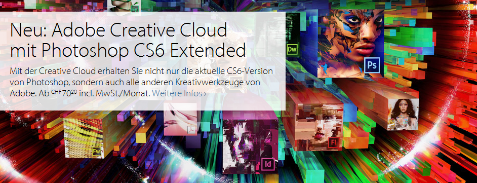 Für CHF 70.20 pro Monat, bei einer Abo-Dauer von einem Jahr, erhält man alle Produkte und Dienste der neuen Creative Suite 6. Die Produkte können alle lokal installiert während der gesamten Abo-Dauer einwandfrei eingesetzt werden. Zusätzlich stehen weitere online Dienste zur Verfügung, um die heutige Flexibilität und Mobilität der verschiedenen Geräte zu unterstützen.
