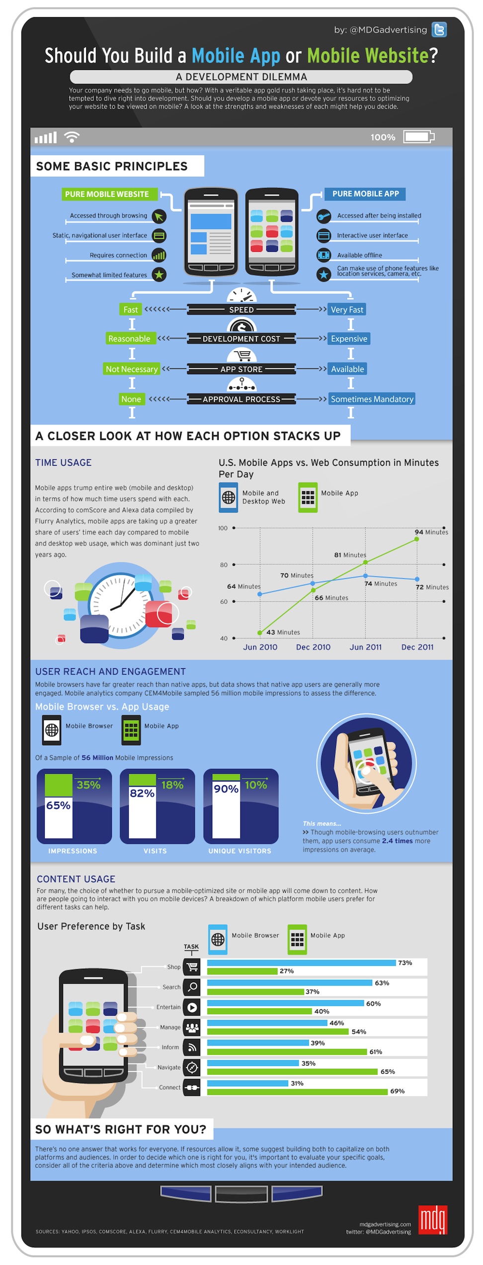 Für eine mobile Website sprechen hingegen die relativ geringen Initialkosten, die einfache Möglichkeit Updates und Erweiterungen hinzuzufügen sowie die Unabhängigkeit von anderen Unternehmen. Mobile Websites können auf allen Smatphones und Tablets betrachtet werden und müssen daher nur einmal programmiert werden. Für Shopping, das Suchen sowie zur Unterhaltung werden mobile Webseiten bevorzugt, wie die Infografik von Mashable zeigt. Dafür können bei mobilen Websites keine Bilder hochgeladen werden. Es ist keine Vollbilddarstellung möglich und es gibt auch keine Möglichkeit für Push-Nachrichten. Ich habe mich zudem gefragt, ob eine mobile Webseite Duplicate Content erstellt. Aber wie Matt Cutts im Video erklärt, ist dies nicht der Fall.