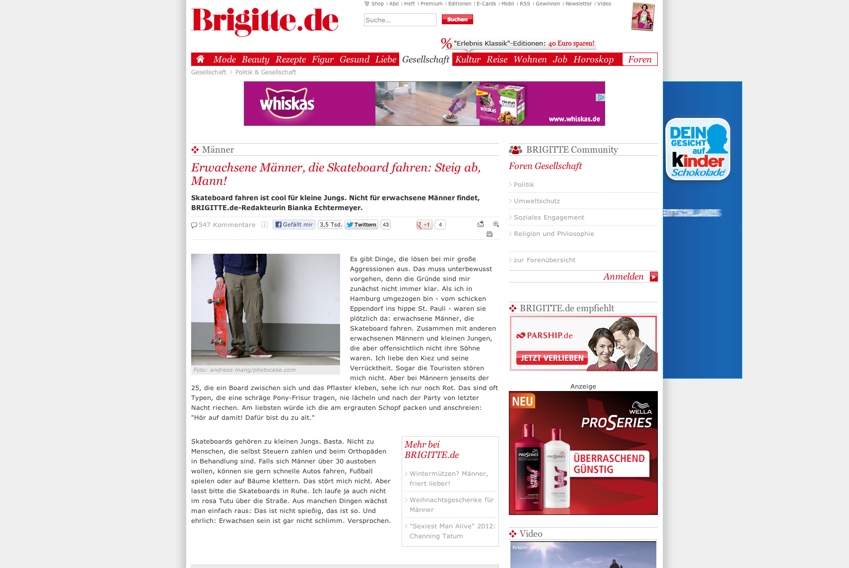 Gestern Nachmittag hat das deutsche Magazin Brigitte auf seiner Webseite einen Artikel publiziert, der mittlerweile grosse Wellen schlägt. Die Autorin Bianka Echtermeyer schreibt, Männer jenseits der 25 sollen nicht mehr Skateboard fahren. Die Community reagiert prompt, mit hunderten von negativen Comments, Shares und Gegen-Fanseiten.
