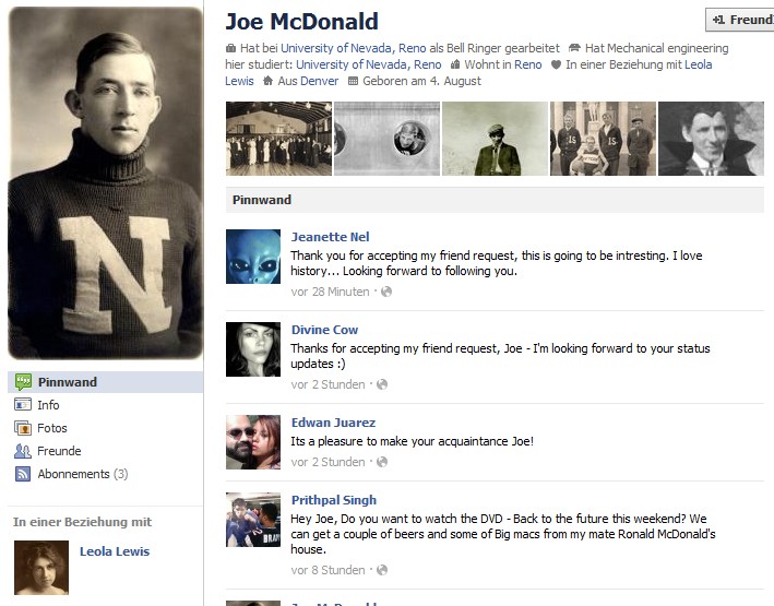 Donnelyn Curtis ist eine Mitarbeiterin der Universität von Nevada und hat auf Facebook zwei Fake-Profile erstellt: Es handelt sich um die Profile von Joe McDonald und Leola Lewis, zwei ehemalige Studenten derselben Universität. Das interessante dabei ist, dass sie ihr Studium bereits 1913 und 1915 abgeschlossen haben.