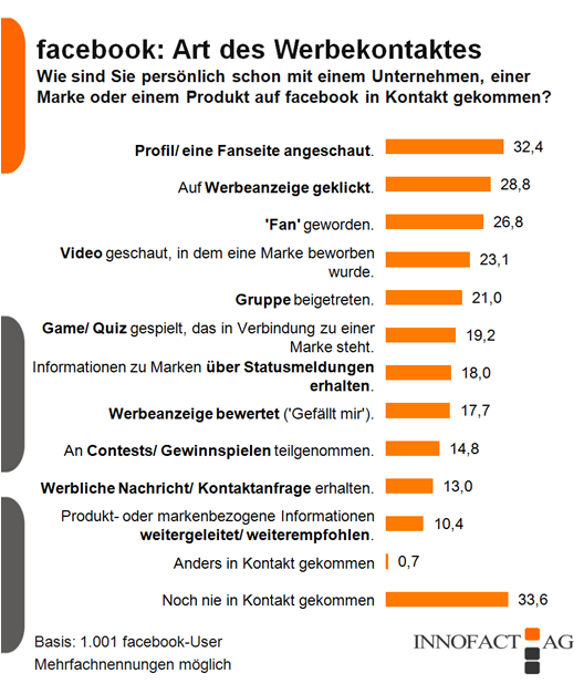 Wie eine Umfrage von Hamburg ergeben hat, hat einen entscheidenden Anteil am Aufbau von Marken. Die Umfrage, welche im Jahr 2010 mit rund 1‘000 Personen durchgeführt wurde, ergab, dass 60 % aller Nutzer durch mit neuen Marken oder Produkten von Unternehmen in Kontakt getreten sind – sei dies durch einen Beitritt als „Fan“ (27%) oder als Mitglied einer Gruppe (21%). Rund 10% der befragten Personen gaben an, dass sie schon Markenbezogene Inhalte an ihre Freunde weitergegeben haben.