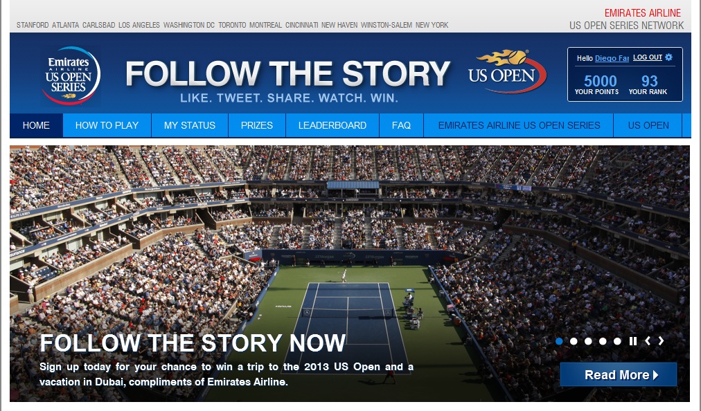 Das Prinzip ist simpel: Auf http://www.usopenfollowthestory.org/ gibt es verschiedene Aufgaben, die man erfüllen muss, um Punkte zusammeln. „Liked“ man zum Beispiel eine Facebook Seite der US-Open, erhält man schon mal 1000 Punkte. Schon für die Registrierung erhält man für den Start 5000 Punkte, die auch aufgestockt werden können, indem man sich Videos ansieht. Solange man aktiv ist auf dieser Seite, kann man also Punkte sammeln.