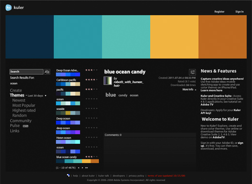 Der Kuler basiert auf der Farbenlehre analoger, monochromer und komplementärer Farbmischung. Wenn man Adobe Nutzer ist, können die erstellten Farbpaletten als Adobe Swatch Exchange (.ASE) exportiert und so ganz einfach als Palette in den CS Programmen verwendet werden. Zusätzlich kann man Fotos hochladen und sich passende Farben dazu anzeigen lassen. Sehr praktisch ist auch, dass man zu einem bestimmten Suchbegriff schöne Farbkombinationen finden kann. Wenn man z.B. für das Thema “Ozean” Farben sucht, findet Kuler diese hier:
