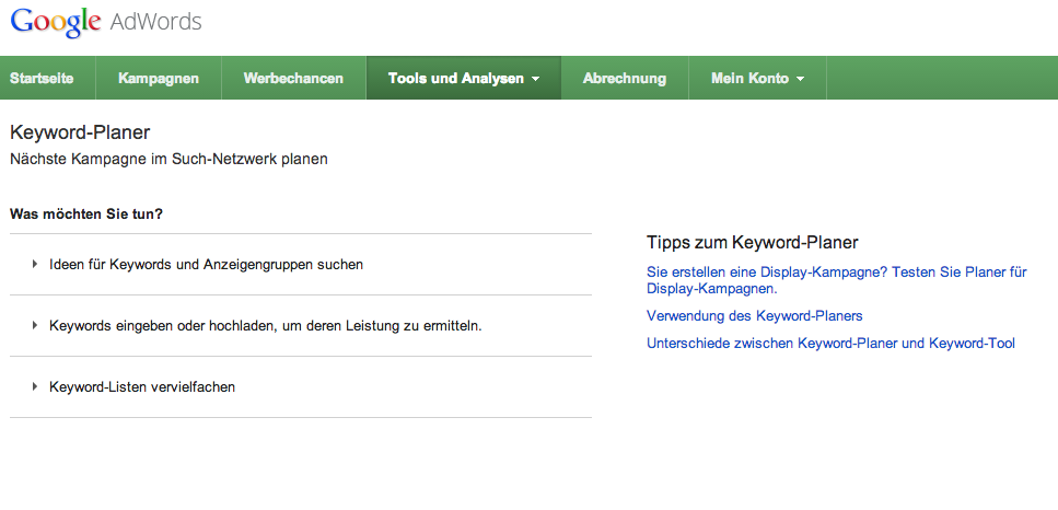 Das neue Tool „Keyword-Planer“ ist bereits im Google AdWords Konto verfügbar und ist wie gewohnt über den Menüpunkt Tools und Analysen erreichbar. Nach einem Klick auf das Tool hat man anschliessend drei weitere Interaktionsmöglichkeiten. (siehe nachfolgender Screenshot)