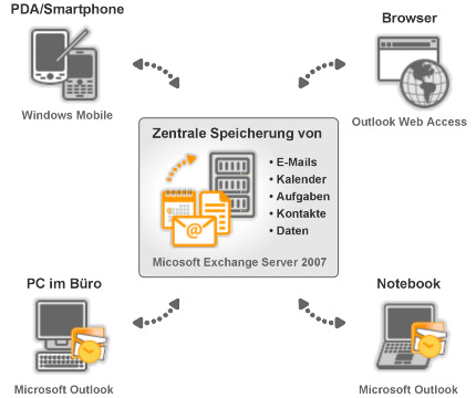 Exchange Server verwalten, nebst weiteren, hauptsächlich folgende Informationen der einzelnen Benutzer: E-Mails, Kontakte, Kalender, Aufgaben. Interessant wird es allerdings bei den Zugriffsmöglichkeiten. Nebst dem gewohnten Abruf in Outlook oder auch Apple Mail, ist der Outlook Web Access in der Regel ohne Zusatzkosten bei Hosted Exchange Paketen enthalten. Ein Webmailer, welcher in vielen Betrieben nur wegen der nicht komplett implementierten Groupware Funktionen Outlook noch nicht ersetzt. Natürlich werden auch Smartphones bedient. Mittels sogenanntem „PUSH“ Dienst ist auch die Hosentasche – und umgekehrt die Homebase – jederzeit mit den neuesten Daten ausgerüstet.