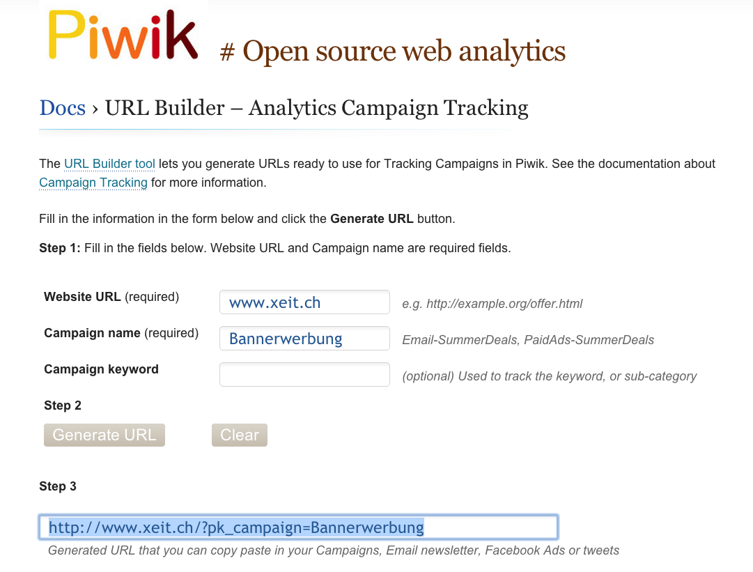 Um hier Informationen zu erhalten, ist es notwendig, die jeweiligen Ziel-URLs der Kampagnen mit zusätzlichen Tags zu versehen. Am einfachsten ist es dabei, mit dem Piwik URL-Builder zu arbeiten. Nach Eingabe der entsprechenden Informationen wird die neue URL automatisch erzeugt.