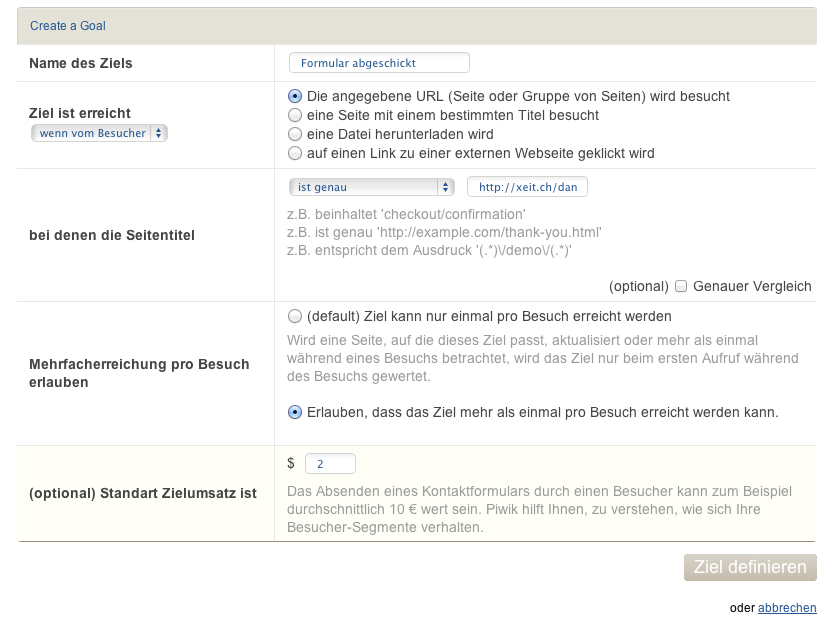 Im nächsten Schritt muss definiert werden, wie das Ziel genau aussieht. In diesem Fall wird die Option „die angegebene URL wird besucht“ ausgewählt. Schliesslich gelangt der User nach erfolgreichem ausfüllen des Formulars auf eine bestimmte URL (in diesem Fall http://xeit.ch/danke). Dementsprechend muss „ist genau“ im Drop-Down Menü angewählt werden. Ändert die URL bei jedem User geringfügig, ist beispielsweise die Option „entspricht dem Ausdruck“ zu wählen.