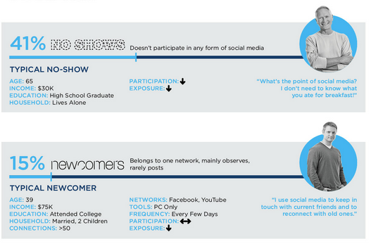 Der typische No-Show interessiert sich dabei überhaupt nicht für Social Networks und sieht in deren Nutzung auch überhaupt keinen Sinn. Der Newcomer hingegen tastet sich langsam an die verschiedenen Kanäle wie Facebook oder YouTube heran (allerdings ausschliesslich über den PC) und ist dort alle paar Tage aktiv.