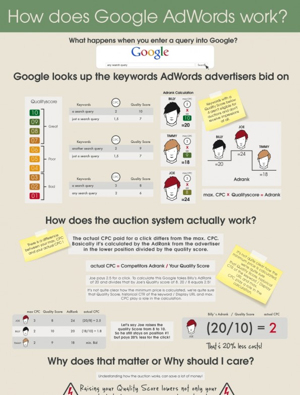 Grundsätzlich basiert das ganze Prinzip von Google AdWords auf einem Auktionssystem. An dieser Auktion nehmen automatisch alle Werbetreibenden teil, welche Ads für ein bestimmtes Keyword gebucht haben. Es wird dabei jedes Mal wieder neu entschieden, welche Anzeige auf welchem Platz ausgeliefert wird. Der sogenannte Ad-Rank spielt hier die entscheidende Rolle. Dieser setzt sich aus dem maximalen Gebotspreis (CPC) und dem Qualitätsfaktor zusammen. Umso höher der Qualitätsfaktor, desto weniger muss für eine entsprechende Top-Platzierung bezahlt werden. Aus diesem Grund lohnt es sich die eigenen AdWords-Kampagnen einem kritischen Blick zu unterziehen. Die Infografik erklärt dieses Prinzip an einem Beispiel sehr gut.