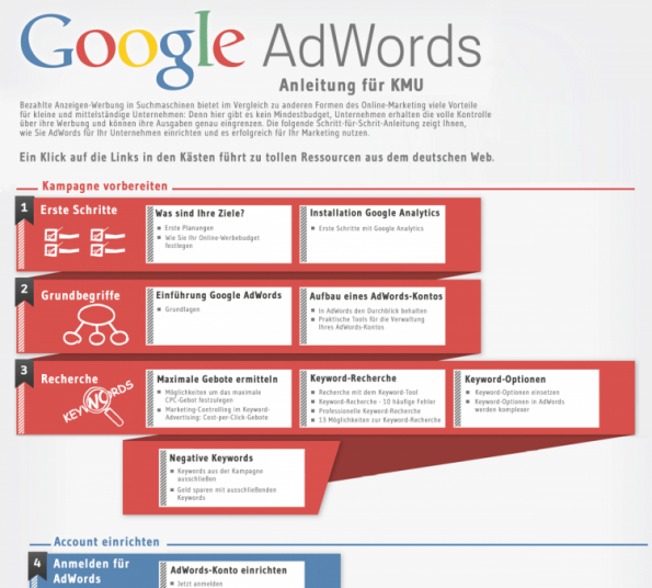 Die Infografik ist in drei grosse Bereiche aufgeteilt: Kampagne vorbereiten, Account einrichten und Konto optimieren. In jedem der Abschnitte werden typische Fragestellungen und Themen aufgegriffen wie z.B., welche verschiedenen Keyword-Optionen es gibt.