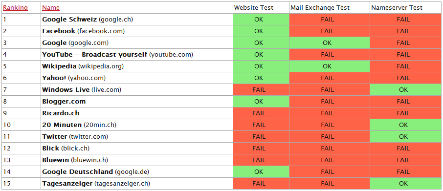 Auf folgender Tabelle seht ihr den aktuellen Status der meist aufgerufenen Websites in der Schweiz: