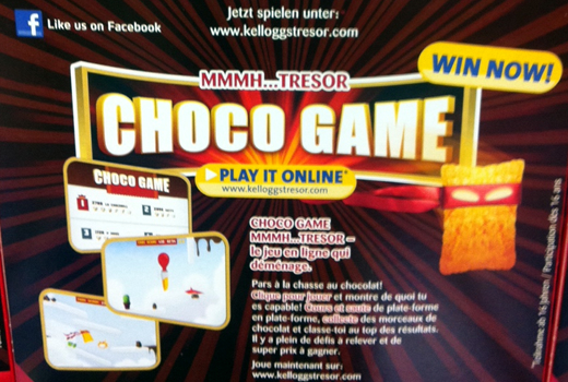 Zurück in die Gegenwart. Auf der Packung von Kellogg’s Tresor (das sind diese Weizen Kissen mit Schokolade drin) wird aktuell das “Choco Game” beworben. Auf der angegebenen Landingpage kelloggstresor.com befinden sich Links zu den Facebook-Pages der unterschiedlichen Länder. Mehr nicht. Natürlich gibt es auch eine Schweizer Fanpage. Seit Juni aufgeschaltet, zählt sie aktuell 599 Likes. Auf der Pinnwand gibt es noch nicht viel zu sehen. Der Dialog wirkt etwas angestrengt – (im Stil von #TwitternWieCommunitymanager ). Zum Tresor Game gehts über die Apps Row. Von dem Tab wiederum wird man weitergeleitet auf eine App (diese ist nicht auf der Fanpage eingebunden). Wer nun noch die Zugriffsberechtigungen akzeptiert ist endlich am Ziel. Ein langer Weg – für ein schön gemachtes aber simples Jump n’Run Game.