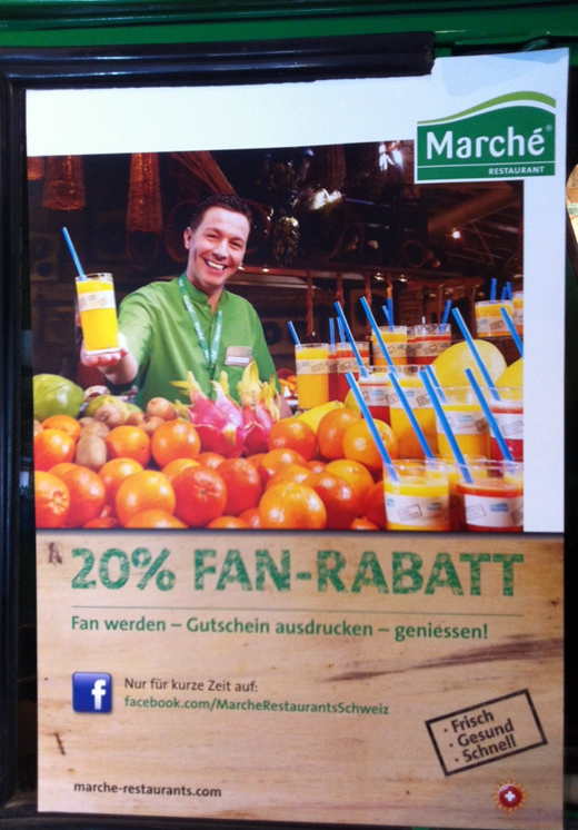 Facebook Fans echte Mehrwerte bieten – ist der strategische Erfolgsfaktor schlechthin. Marché Restaurants zeigen sich grosszügig und bieten ihren Fans (für begrenzte Zeit) 20% Rabatt.