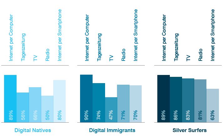 Gemäss dem Media Use Index dominieren bei den Jungen das Internet per Desktop und per Smartphone – spannend dazu auch „The Rise of the Mobile-Only User“. Aber auch schön zu lesen in der Grafik: Internet ist für alle Generationen zum wichtigsten Medium avanciert. Allerdings dürfte die effektive Nutzungsdauer der einzelnen Medien je nach Altersgruppe stark variieren. So nutzt die 50+-Generation das Fernsehen wohl überdurchschnittlich (aber dazu dann später einmal mehr).