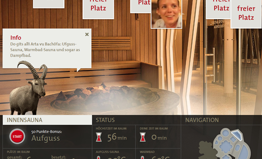 Alles in allem eine richtig gelungene Idee. Kreativ, gut umgesetzt und auch noch zielgerichtet – die Grafiken und Infos über die einzelnen Räume machen richtig Lust auf einen Besuch in der Bäderlanschaft. Und: Ab und zu wird auch noch ein einschlägiges Angebot eingeblendet. Kurz, unaufdringlich und passend.