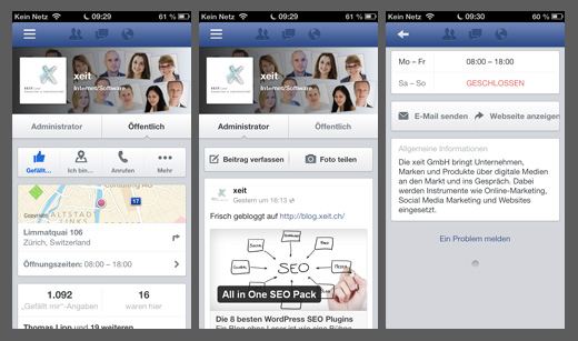 Allgemein wurde das Design der Fanpages noch stärker mobil optimiert und weiter vereinfacht. Die wichtigsten Informationen über ein Unternehmen, sowie die Kontaktmöglichkeiten sind nun direkt nach dem Header in Form von Icons ersichtlich oder anwählbar. Auch erhält der User auf einen Blick Informationen über die Öffnungszeiten und eine Anfahrtsskizze. Der Fokus der mobilen Fanpages liegt nun ganz klar auf der möglichst einfachen Kommunikation und Interaktion mit der jeweiligen Seite.
