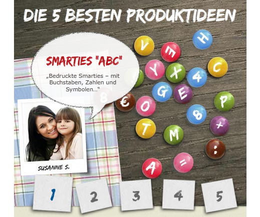 “Entdecken, Shoppen, Mitmachen” ist das Motto. Übersetzt auf Unternehmenssicht heisst das: Cross Selling, Umsatz und Crowdsourcing. Am Spannendsten ist sicher die Mitmach-Komponente. User können Produkte bewerten (mit Sternen und Text), sich als Produkttester bewerben und eigene Produkt-Ideen einreichen. (wobei die derzeit auf der Seite publizierten Ideen etwas nach Agenturvorleistung aussehen – oder sollen wir wirklich glauben dass so schöne Frauen mit so schönen Kindern auf so schöne Ideen kommen wie ein Smarties ABC?;-))