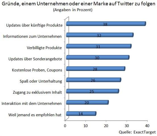 Des Weiteren untersuchte die Studie aus welchen Gründen die Twitterer Unternehmen folgen. Zwar sind auch hier auf den vorderen Plätzen Gründe wie „Verbilligte Produkte erhalten“ oder „Kostenlose Proben, Coupons“. Allerdings nennen immerhin noch 20% die Interaktion mit dem Unternehmen als Motiv. Im Vergleich zu anderen Social Networks ist diese Zahl als hoch einzustufen.