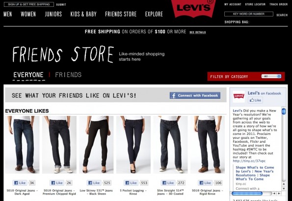 Online-Shops, welche nicht direkt auf der eigenen Fanpage verkaufen möchten, haben darüber hinaus die Möglichkeit, ihren eigenen Shop mit den Daten aus Facebook zu personalisieren. Das bekannteste Beispiel für diese Variante ist vermutlich Levis mit seinem Friend Store. Selbstverständlich funktioniert das alles nur, wenn ein User auch bei Facebook eingeloggt ist – und sich mit beispielsweise Facebook Connect verknüpft hat.
