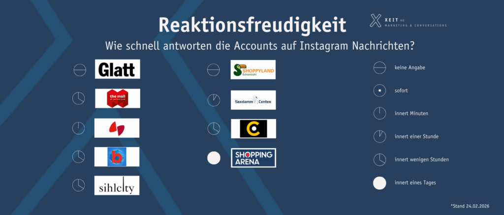 Zu guter Letzt wollten wir wissen, wie aktiv die besagten Shoppingcenter auf Instagram Direktanfragen reagieren. Sichtbarkeit allein reicht nämlich nicht aus – ein echter Austausch mit der Community entsteht nur, wenn auf Anfragen eingegangen wird.