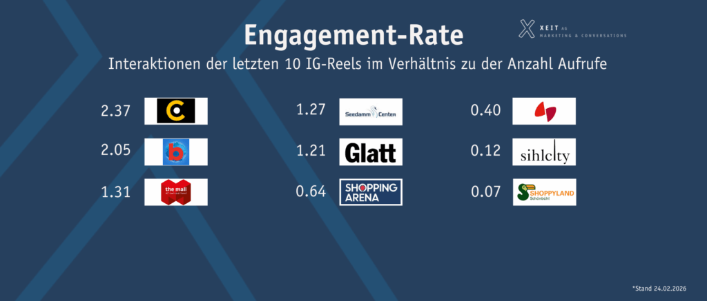 Die höchsten Engagement-Rates erreichte dabei das Emmen Center (2,37 %), gefolgt vom Centre Commercial Balexert (2,05 %) und der Mall of Switzerland (1,31 %).