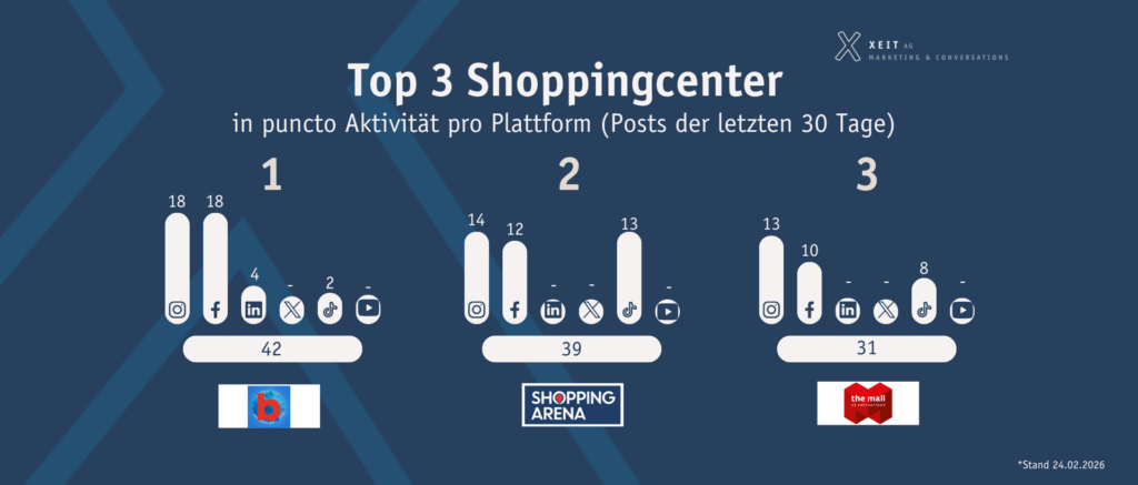 Den zweiten Rang teilen sich YouTube und Instagram, welche von neun der zehn Shoppingcenter bespielt werden. TikTok belegt den dritten Platz mit acht aktiven Shoppingcentern, während LinkedIn von deren sieben genutzt wird. Das Schlusslicht bildet X – vormals Twitter –, hier sind nur noch vier der zehn Shoppingcenter aktiv.