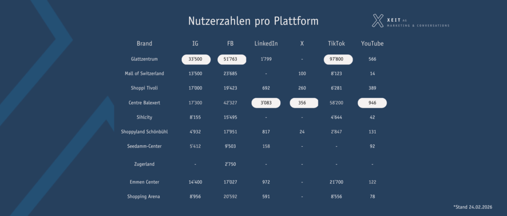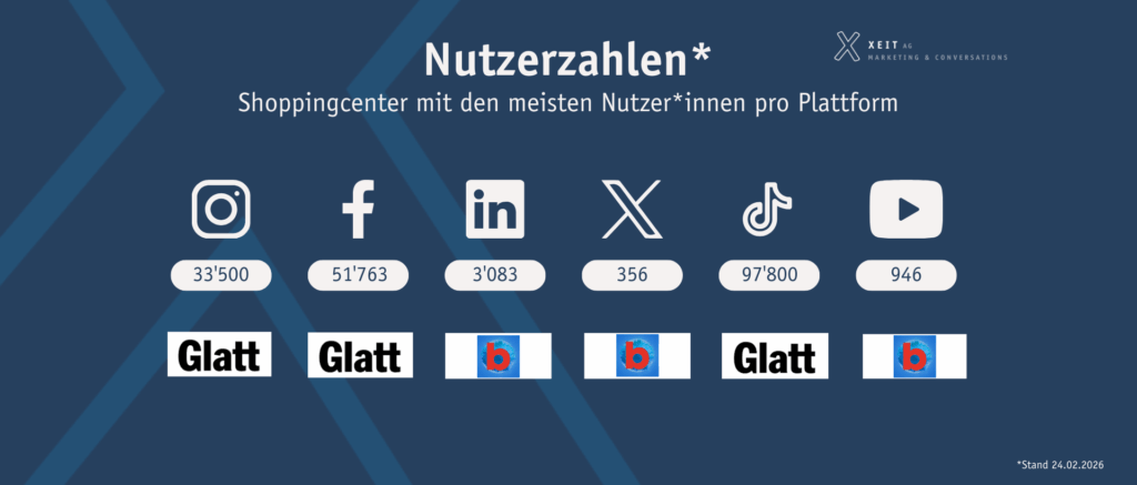 Ein Blick auf die Plattformen zeigt, dass das Glattzentrum und das Centre Commercial Balexert in Sachen Followerzahlen den Kuchen unter sich aufteilen. Das Glattzentrum verzeichnet die meisten Follower auf Instagram, Facebook und TikTok. Das Centre Commercial Balexert wiederum führt auf den Plattformen LinkedIn, X und YouTube.