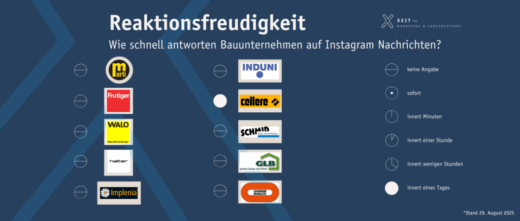 Ein Blick auf die Reaktionsfreudigkeit zeigt: Präsenz heisst nicht automatisch Dialog. Viele Bauunternehmen setzen stark auf Sichtbarkeit, doch in Punkto Interaktion bleiben sie noch zurückhaltend. Wir haben alle Unternehmen per DM kontaktiert und bekamen von Cellere innert eines Tages eine Antwort. Bei den restlichen Unternehmen haben wir auf unsere Anfrage hin nichts gehört. Vielleicht ein Zeichen, dass die Unternehmen in Zukunft mehr auch auf persönlichen Dialog setzen könnten. Denn ein gezielteres Community-Management ist wichtig, vor allem, wenn es um Recruiting, Employer Branding oder B2B-Kommunikation geht.