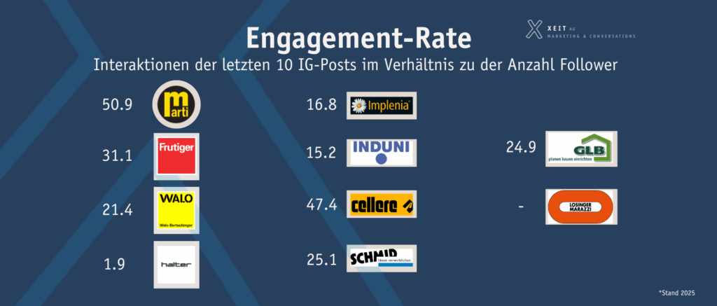 Halter Bauunternehmung (1.9 %) und Losinger Marazzi (keine IG-Posts) nutzen Instagram bislang offenbar eher passiv.