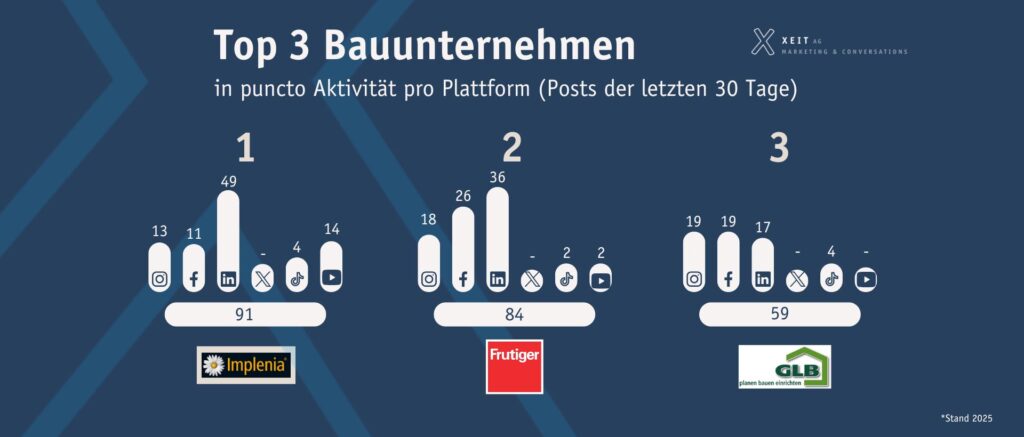 Eines fällt sofort auf: LinkedIn ist auch in der Baubranche das Must-have. Alle untersuchten Bauunternehmen sind auf LinkedIn präsent. Hier informieren sie über Projekte, Karrieremöglichkeiten und Nachhaltigkeitsinitiativen.
