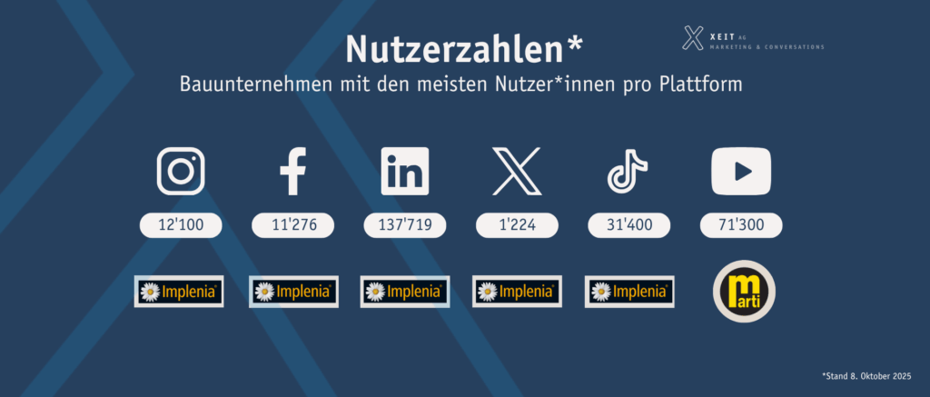 Implenia dominiert mit Abstand die Reichweiten-Rangliste: 12’100 Follower auf Instagram, rund 11’000 auf Facebook, rund 137’719 auf LinkedIn und 31’400 auf TikTok. Auch auf YouTube ist das Unternehmen sehr präsent.