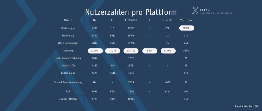 Frutiger AG, WALO Bertschinger und GLB zeigen eine ausgewogene Präsenz über mehrere Plattformen hinweg. Sie kombinieren Social Media mit einer klaren Corporate-Kommunikation und Employer-Branding-Inhalten.