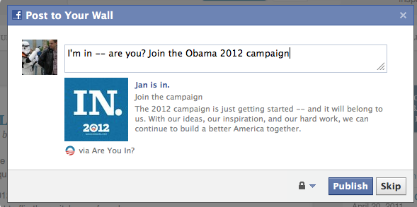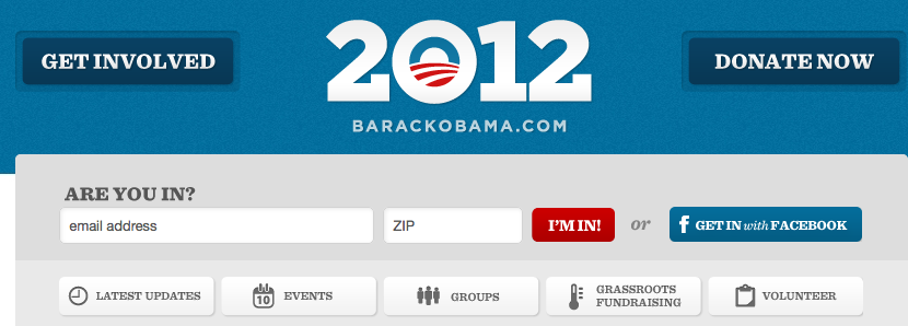 Auch für die Wahlkampagne 2012 setzt Obama wieder verstärkt auf Social Media-Kanäle. Unterstützt wird die Wahlkampagne durch eine Microsite, auf welcher die Social Media-Elemente auf den ersten Blick erkenntlich sind. Neben den Links zu dem jeweiligen Profil bei Twitter und Facebook kann sich der Nutzer via Facebook- Schnittstelle mit der Microsite verbinden. Da die App auf die jeweiligen Freundeslisten der User zugreift, kann man diesen eine sogenannte „Are you in“ Nachricht schicken.