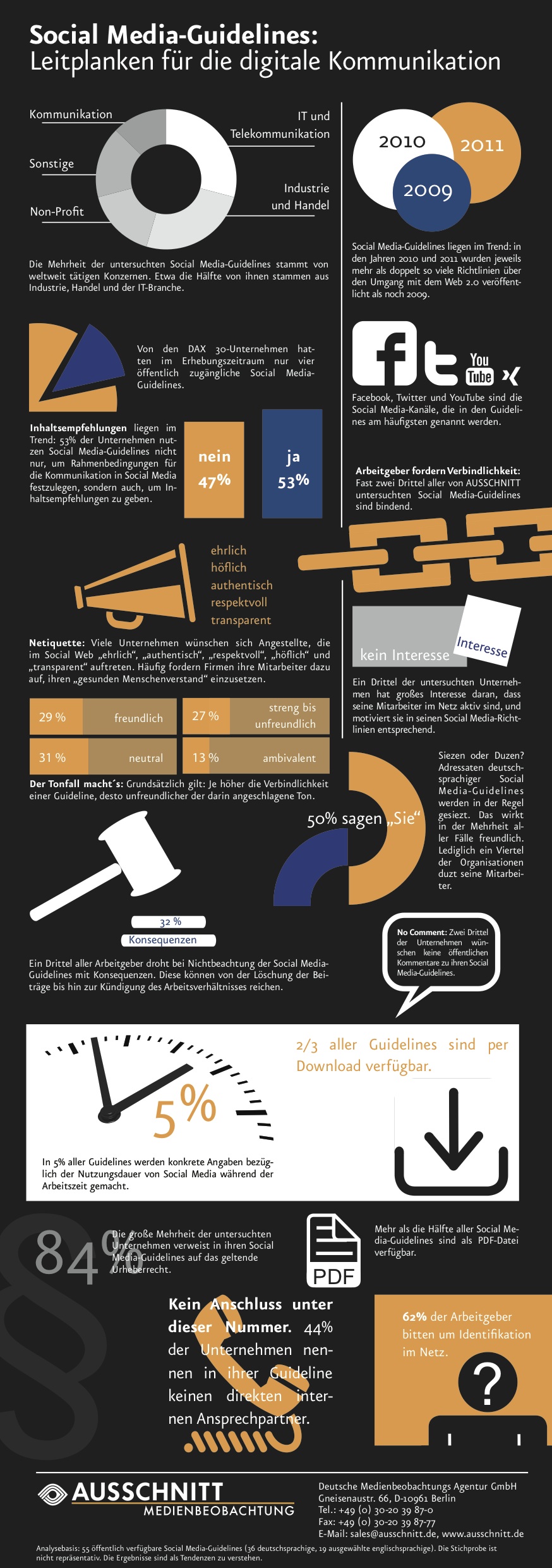 Wir haben uns in unserem Blog bereits die Frage gestellt was in Social Media Guidelines eigentlich alles so reingehört? Doch wie sieht es denn in der Realität aus? Welche Inhalte veröffentlichen die Unternehmen tatsächlich in ihren Guidelines? Die Agentur für Medienbeobachtung AUSSCHNITT aus Berlin untersuchte 55 öffentlich zugängliche Guidelines und fand interessante Antworten.