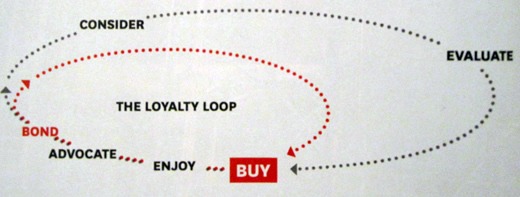 Die eigentliche Verbindung mit dem Produkt / der Marke beginnt nach dem Kauf, nachdem der Konsument damit beginnt, mit dem Produkt und den neuen Online-Touchpoints (sprich Bewertungs-Seiten, Facebook-Fanpages, Umfragen etc.) zu interagieren. Das Resultat dieser Phase hängt natürlich direkt davon ab, ob das Produktversprechen eingelöst wurde oder nicht. Wenn der Kunde zufrieden ist, kann die Verbindung zur Marke so stark werden, dass sie in einem „Enjoy-Advocate-Buy“ Loop mündet, der die Berücksichtigungs- und Evaluierungs-Phasen komplett auslassen.