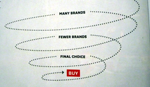 Früher hat man bei der Beschreibung des Entscheidungs-Kauf-Prozesses gerne das Trichter Modell verwendet: Man ging davon aus, dass Konsumenten mit einer grossen Anzahl potenzieller Marken im Kopf begannen und diese dann im Laufe des Entscheidungsprozesses nach und nach reduzierten, bis sie zum Schluss die letzte übrig gebliebene Marke kauften. Das Marketing hat sich darauf konzentriert, mittels Push-Aktivitäten die Brand-Awareness zu stärken, die Berücksichtigung zu unterstützen und schliesslich den Konsumenten zum Kauf zu inspirieren.