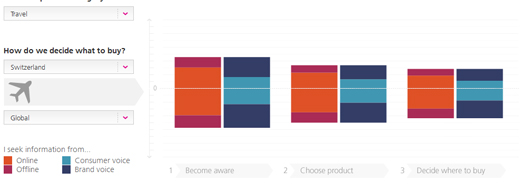 Untersucht man zum Beispiel den Einfluss von Consumer Generated Content während dem Kaufprozess bei den Schweizern, zum Beispiel im Reisebereich, und vergleicht die Werte mit den globalen Studienergebnissen, so zeigt sich folgendes Bild: