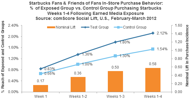 • In den vier Wochen, nachdem Fans eine Meldung  von Starbucks auf Facebook gesehen haben, kauften diese und ihre Freunde insgesamt 38% häufiger dort ein. (Earned Media)
