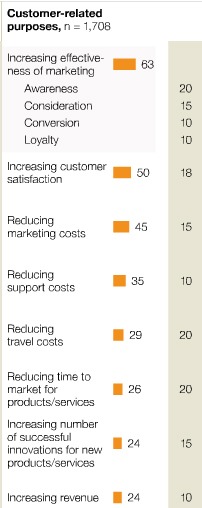 Mc Kinsey hat den „Nutzen durch Social Media“ in drei Kategorien untersucht: Bezüglich interner Prozesse, bezüglich Kunden-bezogener Elemente und bezüglich der Zusammenarbeit mit Partnern&Lieferanten. Grau ist die durchschnittliche Verbesserung, der Median. Orange der Anteil an Unternehmen in Prozenten, die angeben, von Verbesserungen zu profitieren.