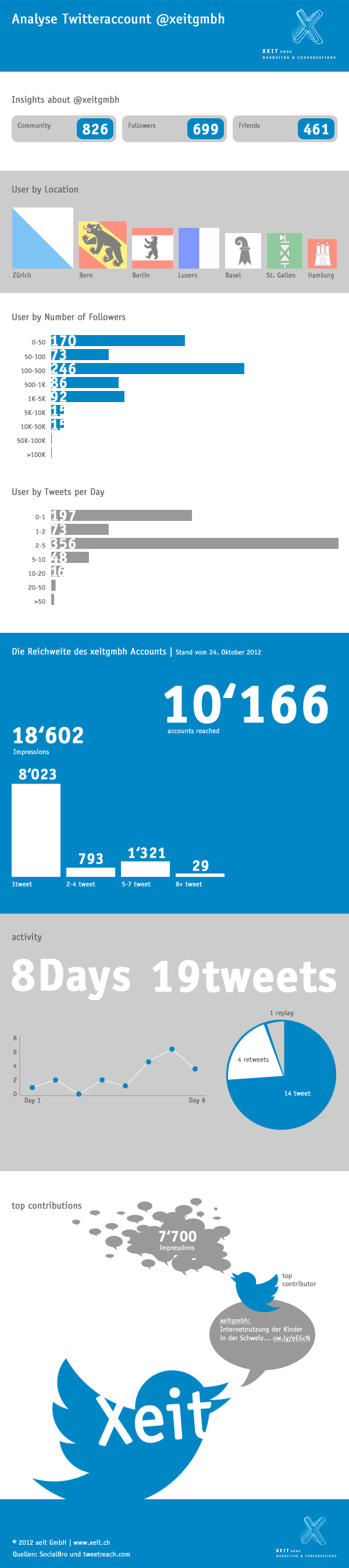 Twitter ist eine wichtige Plattform, um direkt und einfach ein Netzwerk auf- und auszubauen. Und zudem ein optimales Instrument, um rasch Nachrichten oder Hinweise auf Blogsposts zu streuen. Und das Soziale Netzwerk hat auch den Nebeneffekt, dass wir up to date bleiben. Um aber den Erfolg dieser Plattform zu messen haben, wir eine kleine Analyse unseres eigenen Twitter-Accounts @xeitgmbh durchgeführt (Stand vom 24. Oktober).