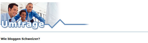 C. Reichmuth studiert an der Universität in Fribourg im Nebenfach Medien- und Kommunikationswissenschaften. Für eine wissenschaftliche Untersuchung im Rahmen eines Seminars bei Frau Prof. Dr. Philomen Schönhagen und lic. rer. soc. Stefan Bosshart möchte sie eine Internet-Umfrage durchführen. Im Mittelpunkt stehen dabei Autoren von deutschsprachigen Schweizer Blogs. Liebe Schweizer BloggerInnen, macht mit an der Online-Umfrage, und helft ihr.