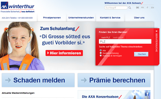 Und wenn man die Antworten auf diese Frage dann ganz konsequent auf die Informationsarchitektur anwendet, kommt so etwas heraus wie die Startseite von Axa Winterthur.