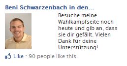 - Der Grünliberale Beni Schwarzenbach habe ich auch ohne Link vom Wahlflyer gefunden – er nimmt sein Glück selber in die Hand und schaltet Facebook Anzeigen: