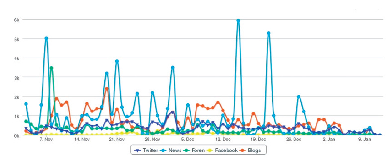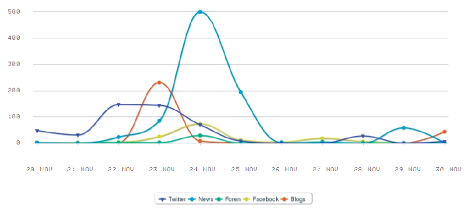 Die obige Grafik zeigt die Häufigkeit von Sätzen, in denen Adidas im Zusammenhang mit den Hundetötungen in der Ukraine genannt wurde, sowie die Dauer des Shitstorms in den verschiedenen Nachrichtenkanälen. Zu erkennen ist, wie die Nachricht – von Twitter ausgehend – bei den klassischen journalistischen Online-Medien ankommt. Die sozialen Netzwerke spielten eher als Sammlungsort der Tierschützer eine Rolle. Der „Angriff“ der Adidas-Facebook-Seite war kleiner als behauptet – vom „Social- Media-GAU“ kann keine Rede sein.