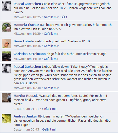 Beachtet man z.B. die aktuelle Diskussion auf der Facebook Fanpage von Slow Down Easy zu einem Wettbewerb, so ist Community Managern gut geraten, Diskussionen laufend zu beobachten und sich zeitnah in die Diskussion einzubringen.